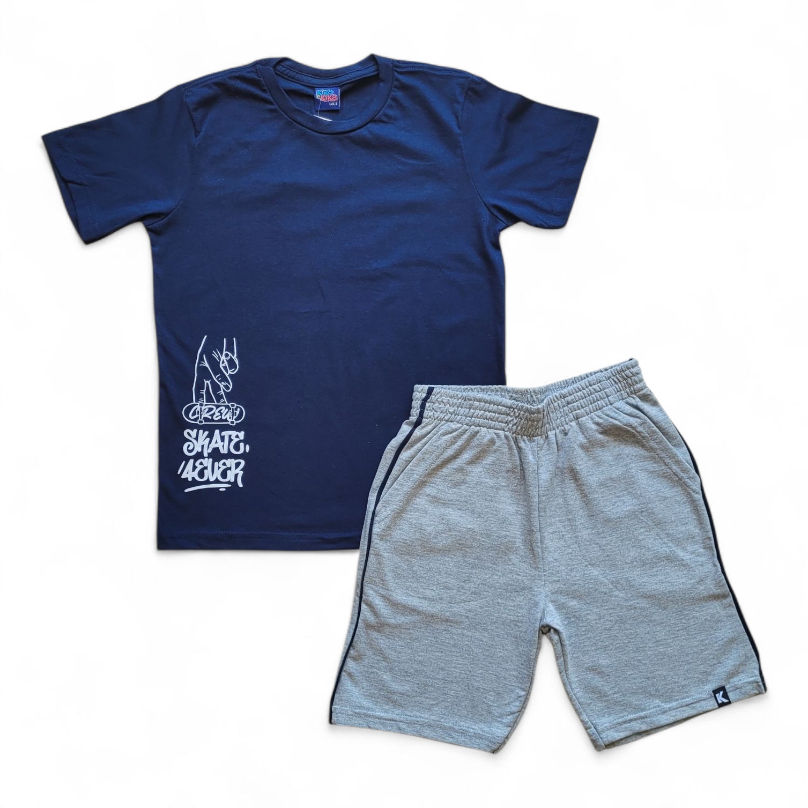 Conjunto masculino camisa azul marinho e bermuda cinza com detalhes