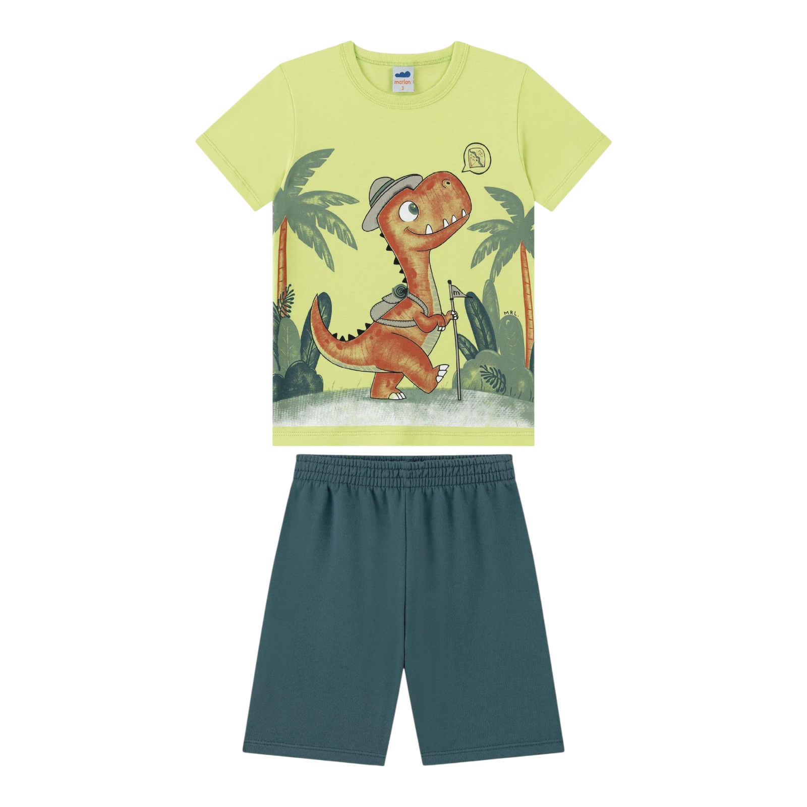 Conjunto masculino camisa na cor verde lima estampa dinossauros