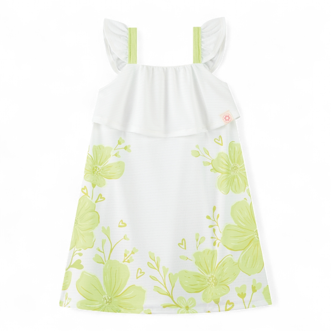 Vestido em cotton maquinetado na cor branca com detalhes em verde
